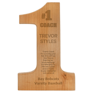 Red alder specialty plaques are available as: boat paddle with leather strap (18″ x 3/4″ thick), #1 plaque (8 1/4″ x 12 1/2″ x 1/2″), apple plaque (8″ x 9 1/2″ x 1/2″), heart plaque (9 1/2″ x 9 1/4″ x 1/2″), clover plaque (9 3/4″ x 10 1/4″ x 1/2″), football plaque (11″ x 6 1/2″ x 1/2″), round plaque (9 1/2″ diameter x 1/2″).