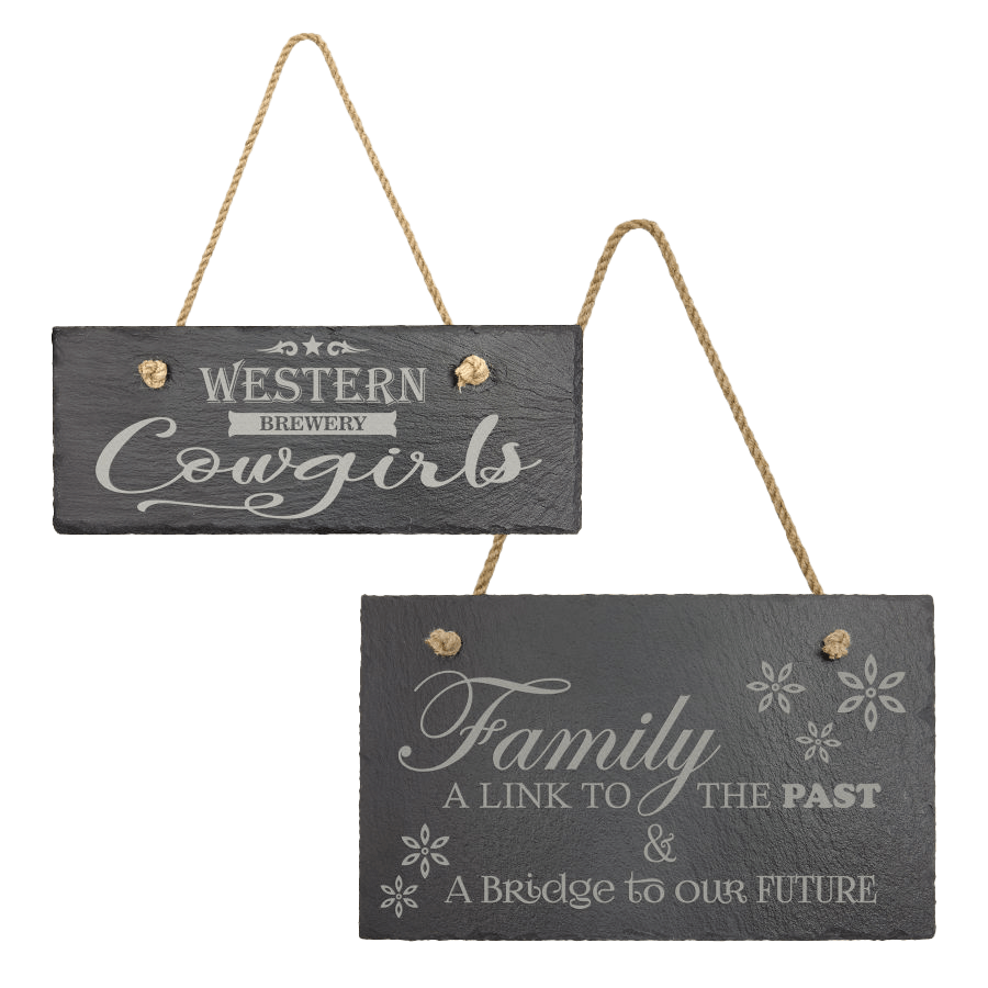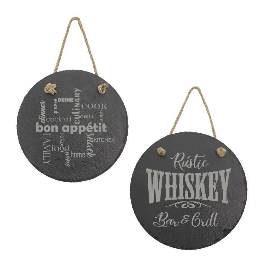 Slate decor is available in: oval with a string (11 3/4″ x 7 3/4″ and 7 3/4″ x 6″), round with a string (7″ diameter and 7 3/4″ diameter), rectangle with a string (10″ x 4″ and 11 3/4″ x 7″), rectangle with stands (5 x 7″, 7 x 9″, and 8 x 10″), round (9 3/4″ diameter and 11 3/4″ diameter), rectangle with a string (9 x 6″, 11 1/2″ x 8 3/4″ and 13 3/4″ x 9 3/4″), paddle shaped with a string (13 1/2″ x 7″)